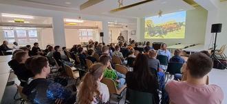Die Schülerinnen und Schüler der 5. Klassen verfolgen zusammen mit Lehrkräften gebannt den Worten und Bildern von Michael Rischer