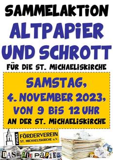 Unsere Herbstsammlung „Altpapier und Schrott“ für die St. Michaeliskirche Pausa findet am 4. November 2023 von 9:00 – 12:00 Uhr an der Pausaer Kirche statt. Wir freuen uns wieder herzlich auf Ihre „gesammelten Werke“. Da wir an diesem Tag wieder zwei große Container bestellt haben, würden wir uns wieder über große Mengen Papier und Schrott freuen. Vielen Dank.