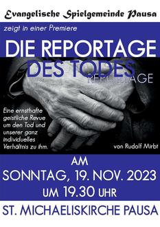 Auch in diesem Jahr im Herbst führt die Evangelische Spielgemeinde Pausa wieder ein Verkündigungsspiel in der Pausaer Kirche auf. Das diesjährige Stück trägt den Namen „DIE REPORTAGE DES TODES“ und wurde von Rudolf Mirbt verfasst. Es wirbt mit dem Untertitel „Eine geistliche Revue“.