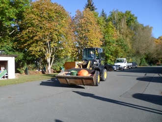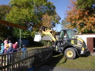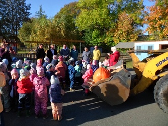 Am Montag, den 23.10.2023 wurden die Kinder und Erzieherinnen der Kita “Kleeblatt“ in Mühltroff überrascht. Als alle Kinder im Garten spielten, kam ein Radlader des Betonwerkes Mühltroff auf das Gelände gefahren. Gespannt schauten die Kinder auf das, was sich in der Schaufel befand. Ein riesiger Kürbis, ein Korb Äpfel, Süßigkeiten, kleine Spielsachen und natürlich Sand für den Spielplatz. Im Beisein von unserem Bürgermeister, Herrn Pohl, dem Geschäftsführer der VS Vogtland e.V, Herrn Schwarzenberger, der Geschäftsführerin des Betonwerkes, Frau Dietrich, Herrn Heinrich und Krawetzke (beides Mitarbeiter der Betonwerkes Mühltroff) und Herrn Bauer, einem Gärtner aus Zeulenroda bedankten sich die Kinder mit einem Lied über Handwerker für die tolle Überraschung. Und es ging noch weiter. Der Radlader kippte noch 1 Tonne Kies unter unser Klettergerüst. Gespannt verfolgten die Kinder dieses Geschehen.