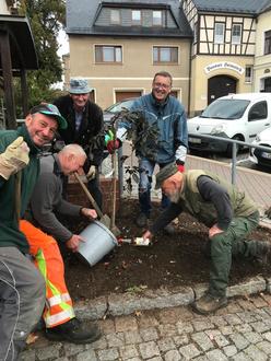 Ebenfalls fand an diesem Tag die „Verschönerungsaktion“ vor der Schmierstube statt. Unsere Männer zeigen sich von ihrer gartengestalterischen Seite und pflanzten unser „Geschenk“ der Stadtverwaltung eine Hängebuche auf den Vorplatz zur Erdachse. Die Grabungsarbeiten gestalteten sich zwischenzeitlich etwas schwierig und mancher Einwohner dachte schon, man grabe nach einem zweiten Erdachsenstumpf. Am Ende fand das Bäumchen jedoch seinen Platz und dient ebenfalls der weiteren Gestaltung rund um die Erdachse.
