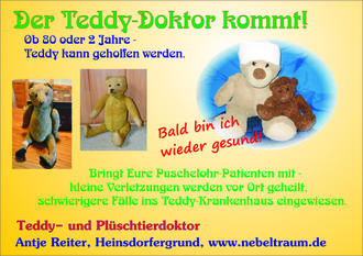 Da sich in der Ausstellung eine Vielzahl von betagten Teddys tummeln, kommt am Samstag, dem 07.12.2024 zum Weihnachtsmarkt die Teddy- Doktorin Antje Reiter zu uns.