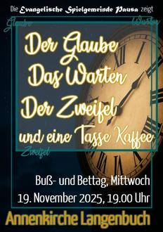 In diesem Jahr, am Buß- und Bettag laden wir herzlich zu unserem Verkündigungsstück „Der Glaube, das Warten, der Zweifel und eine Tasse Kaffee“, am Mittwoch, den 19. November 2025, um 19:00 Uhr in die Annenkirche nach Langenbuch ein.