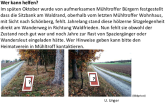 Im späten Oktober wurde von aufmerksamen Mühltroffer Bürgern festgestellt dass die Sitzbank am Waldrand, oberhalb vom letzten Mühltroffer Wohnhaus, mit Sicht nach Schönberg, fehlt. Jahrelang stand diese hölzerne Sitzgelegenheit direkt am Wanderweg in Richtung Waldfrieden. Nun fehlt sie obwohl der Zustand noch gut war und noch Jahre zur Rast von Spaziergänger oder Wandersleut eingeladen hätte. Wer Hinweise geben kann bitte den Heimatverein in Mühltroff kontaktieren.