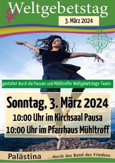 Auch in diesem Jahr laden wir herzlich zu den Gottesdiensten des Weltgebetstages am Sonntag, dem 3. März ein, jeweils um 10:00 Uhr im Kirchsaal in Pausa und im Pfarrhaus in Mühltroff.