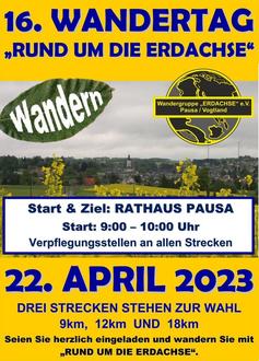 Die Wandergruppe „Erdachse“ e. V. Pausa/Vogtland lädt wieder herzlich zum traditionellen Wandertag „RUND UM DIE ERDACHSE“ ein.