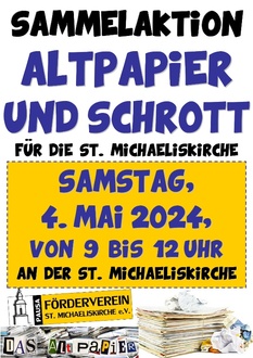 Unsere nächste Papier- und Schrottsammlung findet am Samstag, dem 4. Mai 2024, in der Zeit von 9:00 bis 12:00 Uhr vor der St. Michaeliskirche Pausa statt.