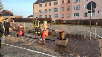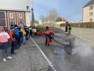 Die Klassen wurden in zwei Gruppen eingeteilt und durchliefen jeweils zwei Stationen. An der ersten Station erwartete Herr Weber die Kinder. Er stellte die Ausrüstung und die verschiedenen Fahrzeuge der Feuerwehr vor und beantwortete die Fragen der neugierigen Grundschüler. Ein besonderes Highlight war es, als die Kinder selbst in ein Feuerwehrauto einsteigen durften. An der zweiten Station, die im Freien stattfand, wurden die Viertklässler von Herrn Schumann angeleitet. Hier konnten sie selbst aktiv werden: Jedes Kind hatte die Gelegenheit, mit einem Feuerlöscher ein kleines Feuer in einer Feuerschale zu löschen. Diese praktische Übung verdeutlichte den Schülerinnen und Schülern eindrucksvoll, wie wichtig ein schnelles und gezieltes Handeln im Brandfall ist.