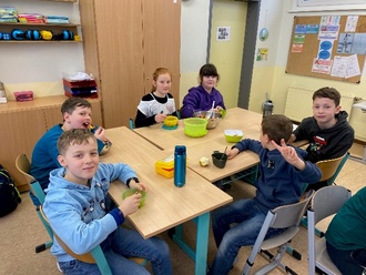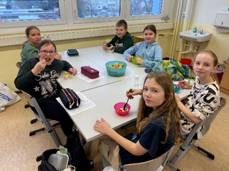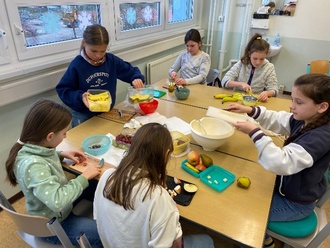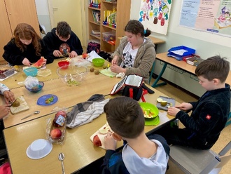 Im Englischunterricht der 4. Klassen stand im Februar das Thema „fruit & vegetables“ (Obst & Gemüse) lt. Lehrplan an. Passend dazu haben wir in einer Doppelstunde unseren eigenen „fruit salad“ zubereitet. Äpfel, Bananen, Birnen, aber auch Melonen, Erdbeeren, Mangos, etc. wurden dafür in kleine Stücke geschnippelt. Am Ende hatten wir 4 verschiedene Obstsalate, die wir uns alle schmecken ließen.