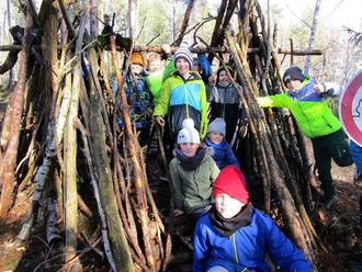 Bei schönstem Wetter ging es in den Wald. Dort fanden zwei Kinder ein Rehgebiss. Alle bauten sich Höhlen aus Naturmaterialien.