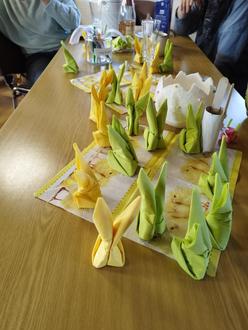 Bei Kaffee, Kuchen und netten Gesprächen wurde es auch den (Groß-) Eltern nicht langweilig. Trotzdem wurden diese ebenso zwischendurch unterbrochen und mussten beim Servietten falten ihre Fingerfertigkeit unter Beweis stellen. Auch einige wenige Männer haben den Weg ins Dorfgemeinschaftshaus Wallengrün gefunden und versuchten sich am Basteln.