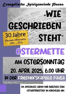 In diesem Jahr nun feiern wir das 30-jährige Jubiläum der Ostermette und so möchten wir Sie hiermit ganz herzlich am Ostersonntag, dem 20. April 2025, um 6:00 Uhr in die Friedhofskapelle auf dem Pausaer Friedhof zur diesjährigen Ostermette mit anschließendem Osterfrühstück im Kirchsaal des Pfarrhauses einladen.
