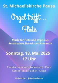Zu einem Konzert für Flöte und Orgel sind Sie, liebe Gemeindeglieder, am Sonntag, dem 18. Mai um 17 Uhr in unsere St. Michaeliskirche in Pausa eingeladen. Es erklingen Werke für Flöte und Orgel aus der Renaissance-Zeit sowie aus Barock und Romantik. Aber auch die Flöte sowie die Orgel kommen solistisch zur Geltung.