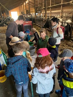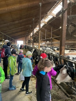 Anfang Mai besuchten unsere Zweitklässler im Rahmen des Sachunterrichts den Agrarbetrieb Floß in Pausa. Täglich werden dort frische Rohmilch oder eigens produzierte Milchprodukte zum direkten Verkauf angeboten. Im Sachunterricht behandeln die Schüler und Schülerinnen derzeit die Heim- und Nutztiere. Daher bot es sich an, den ortsansässigen Bauernhof der Familie Floß zu erkunden. Vor Ort wurden die Kinder in zwei Gruppen eingeteilt. Eine Gruppe war für das Füttern der Kühe verantwortlich. Sorgfältig stellten sie das Futter nach Anleitung zusammen und kümmerten sich um die Tiere. Währenddessen stellte die andere Gruppe Butter aus Sahne her. Mit dem frisch gebackenen Brot, das Frau Floß extra für die Kinder gebacken hatte, schmeckte die selbst gemachte Butter natürlich hervorragend. Das Highlight waren kleine Katzenbabys, die erst kürzlich das Licht der Welt erblickten.