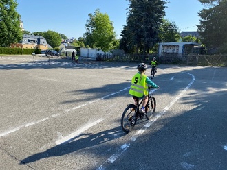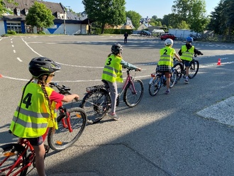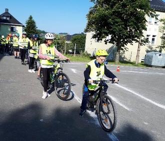 Die Radfahrausbildung der 4. Klassen fand vom 12.6. bis zum 15.6.23 statt. Zuerst absolvierte die 4a den praktischen Teil, dann die 4b. Alle Schüler brauchten ein verkehrssicheres Fahrrad und einen Helm. Vor dem Pausaer Bürgerhaus wurde extra für die Radausbildung der Platz abgesperrt. Der Polizist, Herr Burkhardt, übte fleißig mit jeder Klasse. Dabei lernten die Kinder das sichere Aufsteigen und Anfahren vom rechten Fahrbahnrand. Danach erklärte der Polizist das Umfahren eines Hindernisses. Anschließend übten die Klassen das indirekte und direkte Linksabbiegen. Zum Schluss trainierten die Kinder das Einfahren in Einbahnstraßen und das Abbiegen auf Hauptstraßen. Am Ende hat sich die Anstrengung gelohnt. Alle haben die Prüfung bestanden und ihren Fahrradpass erhalten.
