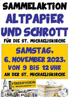 Unsere nächste Papier- und Schrottsammlung findet am Samstag, dem 6. November 2023, in der Zeit von 9:00 Uhr bis 12:00 Uhr vor der St. Michaeliskirche Pausa statt.
