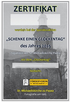 Unser damaliger Pfarrer Frank Pierel hatte sich die Mühe gemacht, die Kosten für ein Tagesgeläut auszurechnen. Er kam auf einen gemittelten Preis von 24,11 €. Somit stand der Betrag für einen Glockentages fest. In den Jahren danach hat sich ein Preis von 25,00 € gefestigt. In den vergangenen 14 Jahren konnten wir bis heute 1.509 Glockentage „verkaufen“ und durch die Aktion „Schenke einen Glockentag“ Spenden in Höhe von 39.719,67 € sammeln. Damit wurden Maßnahmen unserer Kirchgemeinde, wie die Erneuerung des Geläuts, die Trockenlegung unserer Kirche, die Restaurierung der Bleiglas-Schmuckfester und die Sanierung der Treppenhäuser im Turm finanziell unterstützt. Im März dieses Jahres konnten wir nun den 1.500sten Glockentag verkaufen, an dem sich der Spender ein Geläut zu einer Tageszeit wünschen konnte. Vielen Dank für Ihre Unterstützung in den vergangenen Jahren.