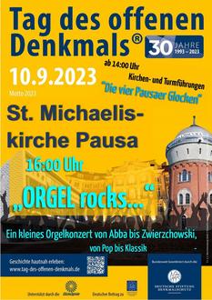 In diesem Jahr möchten wir wieder alle Interessierten und Freunde unserer St. Michaeliskirche Pausa herzlich am Tag des offenen Denkmals, dem 10. September 2023, ab 14:00 Uhr in unsere Michaeliskirche einladen.