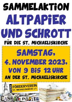 Unsere nächste Papier- und Schrottsammlung findet am Samstag, dem 4. November 2023, in der Zeit von 9:00 Uhr bis 12:00 Uhr vor der St. Michaeliskirche Pausa statt.