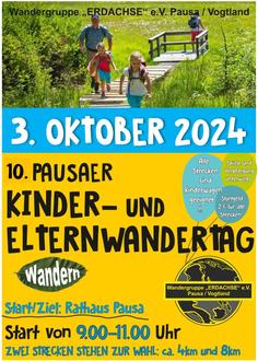 Daher laden wir Sie und Euch zum diesjährigen 10. PAUSAER KINDER- UND FAMILIENTAG am Donnerstag, dem 3. Oktober 2024 nach Pausa ein. START & ZIEL ist wieder am Pausaer Rathaus.