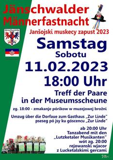 Die Männer finden sich ebenfalls um 17:00 Uhr im BGZ “Zum Goldenen Drachen“ ein. Nach dem Einläuten der Fastnacht gibt es einen kleinen Umzug zur Gaststätte. Ab 19:00 Uhr beginnt der Tanzabend mit den „Peitzer Stadtmusikanten“.