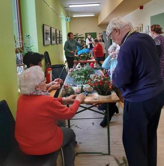 Karola Kopf war ganz in Ihrem Element und sauste geschäftig zwischen Begrüßungen und der Erfüllung jeweiliger Wünsche, wie Klebepistole und Steckmasse, hin und her.
