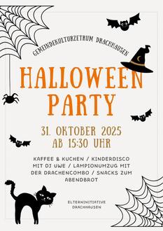 Liebe Kinder, schnappt euch eure Kostüme, verwandelt euch in Hexen oder Geister, nehmt Eltern, Großeltern, Onkels, Tanten und Geschwister mit, packt einen Lampion ein und los geht´s zur Halloweenparty in Drachhausen! Treff ist am Freitag, 31.10.2025 ab 15:30 Uhr im Gemeindekulturzentrum. Wir beginnen mit leckerem Kaffee und Kuchen. Und DJ Uwe wird uns mit einer Kinderdisco begleiten.