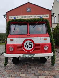 Der 20.10.2023 war für die Kameradinnen und Kameraden der Drehnower Feuerwehr ein besonderer Tag. Genau vor 45 Jahren am 20.10.1978 wurde das Drehnower Löschgruppenfahrzeug LF8-TS8-STA vom Typ Robur LO 1800T in den Dienst gestellt. Bei den Kameraden heißt das Fahrzeug kurz und bündig LO. Somit ist der 20.10. für die Kameradinnen und Kameraden der Drehnower Feuerwehr ein wichtiges Jubiläum, welches auch gebührend gefeiert werden muss. Die Vorbereitungen starteten bereits am Dienstag, hier wurde Tannengrün geholt, welches am Mittwoch zu einer Girlande geflochten wurde. Am Freitag war es dann so weit. Zu seinem Jubiläum wurde der LO schick gemacht, mit Girlande und eigenem Verkehrsschild, welches die Jubiläumszahl trägt. Pünktlich um 17:00 Uhr fanden sich die Kameradinnen und Kameraden sowie die Ehrengäste am Gerätehaus der Feuerwehr Drehnow ein. Zunächst galt es, sich für den Abend zu stärken. Der Jagdhof Drehnow versorgte die Anwesenden mit Schweinebraten und Sauerkraut. Dann konnten sich alle Anwesenden über die generationsübergreifenden Einsatzfahrten mit dem LO austauschen.