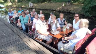 Mit 4 PKW starteten wir - 16 Frauen und 1 Mann. Unser Fährmann, Ulrich Wolff aus Neuzauche, hatte unseren Kahn schon vorbereitet und los ging unsere Fahrt. Eine schöne Route hat er ausgesucht und er erzählte uns nicht nur viel über die Umgebung, sondern unterhielt uns mit vielen schönen Gedichten, die sehr viele Strophen hatten. Ulrich, wie machst du das, solch ein Wissen zu haben ist schon bewundernswert. Auch konnten wir manche Nascherei und gute Getränke konsumieren. Man kann sagen, eine fröhliche und lustige Gesellschaft machte eine Kahnpartie.