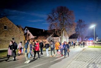 Pünktlich um 18:00 Uhr setzte sich der farbenprächtige und leuchtende Zug in Bewegung. Angeführt wurden wir von der „Drachenkombo“, deren mitreißende Musik die kleinen und großen Teilnehmer beschwingte. Die bunten, selbstgebastelten Laternen der Kinder verwandelten die Straßen in ein Lichtermeer und lockten viele Schaulustige an Fenster und Türen, um das fröhliche Spektakel zu bewundern.