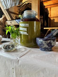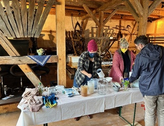 Am 05.10.2024 festigten und erlernten bereits eingeweihte, aber auch neue interessierte, junge Jänschwalderinnen ihr Wissen um das Färben mit Indigo. Alle hatten das Ziel, dieses alte Handwerk zu erlernen. Unter Anleitung von Elke Fiebig wurde die neue Färbeküpe angesetzt. Ein wundervoller Farbwechsel war während der Reaktion der Lösung zu beobachten. Auch die erhoffte „Blume“ auf der Farbe entstand.