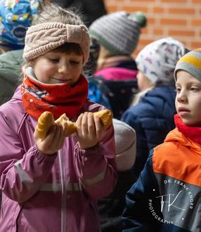 Bei herrlichem Licht teilten die Kinder in der Tradition des Heiligen Sankt Martin frischgebackene Hörnchen, die uns freundlicherweise von der Bäckerei Dreißig gesponsert wurden. Gemeinsam erlebten die Kinder eine tolle Veranstaltung, die ihnen noch lange in Erinnerung bleiben wird. Wir bedanken uns recht herzlich für die Unterstützung bei der Bäckerei Dreißig, bei Familie Schomber für das Lagerfeuer sowie bei Herrn Knorr für die wunderschönen Fotos.