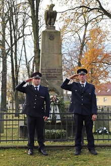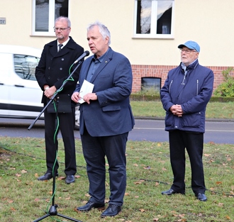 Norbert Krüger sprach die Initiative des Fußballclubs Energie Cottbus „Rot-Weiß statt Braun“ an und ruft die Sportvereine der Amtsgemeinden auf, sich dieser Aktion anzuschließen. Er zitierte dann die Worte Albert Einsteins: „Ich weiß nicht, wie der 3. Weltkrieg geführt wird, aber der 4. Weltkrieg wird mit Stöcken und Steinen geführt. Es ist nicht die Bombe, die Angst macht, sondern die Explosionskraft des menschlichen Herzens zum Bösen.“ Nachdem Norbert Krüger das Totengedenken zum Volkstrauertag, welches erstmals 1952 von Bundespräsident Theodor Heuss eingeführt wurde, gesprochen hatte, legten nach einer Schweigeminute die Kameraden der Freiwilligen Feuerwehr einen Kranz der Gemeinde nieder.