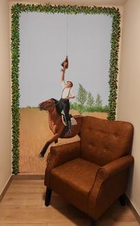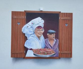 Aus Liebe zur Heimat – Martin kommt selbst aus dem Peitzer Land. Aus Alt mach Neu bedeutet nicht, dass man Tradition und Brauchtum nicht beibehalten könnte. Deshalb behält der Laden seinen Namen „Konsum“ und hat von außen nur einen neuen Anstrich bekommen. Bei der Inneneinrichtung legt er sehr viel Wert auf traditionelle Rohstoffe, wie Holz. Diese sind nicht nur super ökologisch, sondern wirken auch sehr einladend. Martin selbst ist mit der sorbischen Kultur groß geworden. Was ein Teil von ihm ist, soll dann natürlich auch einen Platz in seinem Herzensprojekt finden. So findet man im Innenhof, an der Stelle eines ehemaligen Fensters, ein Gemälde einer Frau in wendischer Tracht. Im Innenbereich schmückt neuerdings ein Reiter beim Hahnrupfen die Wand.