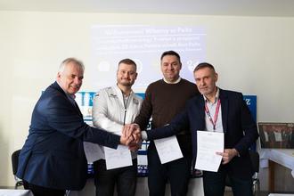 v.l.n.r: Norbert Krüger (Amtsdirektor Amt Peitz), Sebastian Bubner (Präsident Eintracht Peitz), Piotr Kubiak (Vizepräsident ZAP Zbąszynek), Jan Makarewicz (stellv. Bürgermeister Jan Gemeinde Zbąszynek)