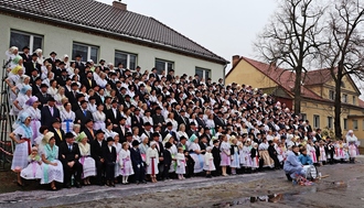Direkt aus der Polonaise heraus warteten danach alle Paare geduldig, bis sie an der Reihe waren, um für das Gruppenbild ihren Platz auf dem hohen Gerüst zu finden. Die Kita Kinder vertrieben sich mit Unterstützung ihrer Erzieherinnen zur Freude der Zuschauer derweil die Zeit mit fröhlichen „Rucki-Zucki-“ und anderen Reigentänzen, bevor auch sie dann ganz brav in der ersten Reihe Aufstellung nahmen.
