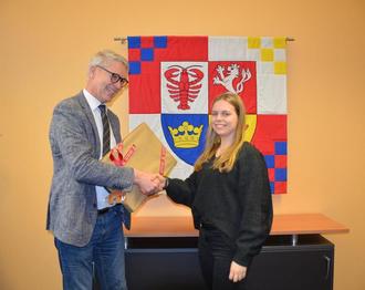 Michael Koch, Bildungsdezernent des Landkreises Spree-Neiße/Wokrejs Sprjewja-Nysa, überreichte am 19. Februar 2024 der Lehramtsstudentin Vanessa Stegitz den Bewilligungsbescheid für ein Stipendium im Fach Sorbisch/Wendisch.