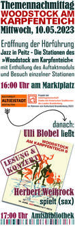 Es erschien uns als geboten, der Veranstaltungsreihe neben der zuletzt genannten Sonderausstellung einen sichtbaren Leuchtturm in Peitz zu setzen und uns an dem Jubeljahr zu beteiligen. Wie im Artikel zum Jubiläum der Amtsbibliothek angedeutet, haben wir dazu eine Doppelveranstaltung geplant, und zwar für den 10. Mai. Gegen 16:00 Uhr starten wir mit der feierlichen Enthüllung des Auftaktmoduls - im Grunde eine Infosäule - für die Hörführung „Jazz in Peitz - Die Stationen des „Woodstock am Karpfenteich““ auf dem Marktplatz in Peitz. Diese Hörführung - der Profibegriff lautet Audio-Guide - ist es, was ich weiter oben mit bescheidenem kommunalen Beitrag andeutete. Erarbeitet haben wir sie in gemeinsamer Arbeit des Bauamtes und des Kultur- und Tourimusamtes und es auch tatsächlich vermocht, so einigen der im vorangegangenen Absatz aufgezählten „Urgesteine“ des Peitzer Jazz‘ einen Wortbeitrag abzuluchsen.