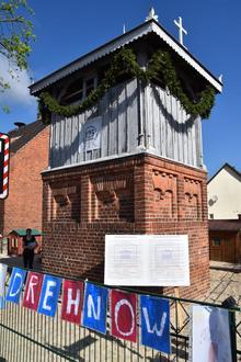 Der Glockenturm wurde mit einer Girlande geschmückt und die Erläuterungen zu seiner Geschichte wurden aufgestellt.
