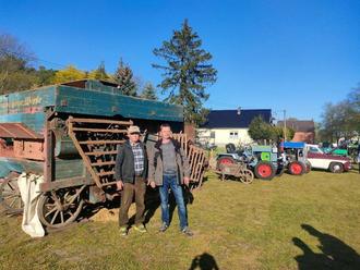 Herrmann und Dirk Kullowatz vor der alten Dreschmaschine