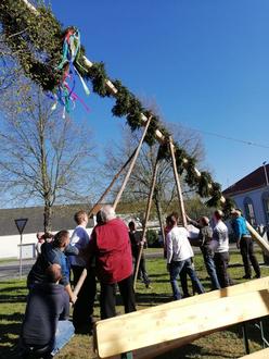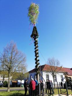Zum Maibaumaufstellen trafen sich alle Interessierten wieder. Flechten und Schmücken war Frauensache. Das Aufstellen vom Maibaum Männersache. Im Dorf ist man darin geübt und so wurde der Maibaum durch klare Ansagen und moderner Technik wie üblich Zügig aufgestellt.