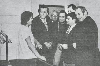 Die Leiterin der Physiotherapie Frau OLM bedankt sich im Raum der Unterwassermassage bei den Vertretern des Kraftwerks Jänschwalde und dem amtierenden Kreisarzt für die neuen Therapiemöglichkeiten und deutlich besseren Arbeitsbedingungen.