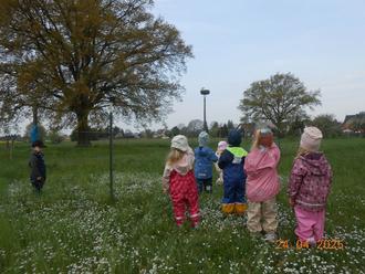 Was gab es hier so zu erleben?Wir nutzen sehr gern die heimatliche Umgebung. So beobachteten wir, wie das Storchennest wieder ein Zuhause für das Storchenpaar wurde. Jede Woche gingen wir leise in die Nähe des Nestes, um zu schauen, ob es schon junge Störche mit schwarzen Schnäbeln gab. Und tatsächlich haben wir sie entdeckt und das aufgeregte Klappern der Elternstörche gehört. Passend dazu sangen wir nun öfter das Lied vom „Klapperstorch“.