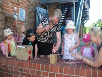 Für die Schulanfänger ging es von einem Höhepunkt zum andern. Nach dem Schnuppertag in der Schule besuchten wir die Peitzer Festung, wo uns Frau Semisch schon freundlich erwartete. Wir versuchten Münzen herzustellen, erfuhren etwas über die Geschichte von Peitz und wer sich traute, ging mit in den Festungsturm. Es ist schon eine wunderschöne Aussicht von dort über die Stadt Peitz hinaus. Ganz besonderes Glück hatten wir und konnten von ca. 30 cm Entfernung eine schlafende Fledermaus sehen. Danke ganz herzlich an Ines Semisch, die uns so herzlich durch die Festung begleitete. Nachmittags feierten wir unser „Zuckertütenfest“, wo die zukünftigen Schüler offiziell mit einer kleinen Feier und einem Programm verabschiedet wurden.