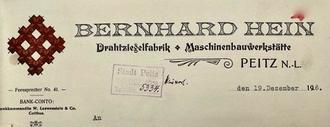 Ingenieur HEIN beantragt am 3. Oktober 1914 persönlich beim Peitzer Amtsgericht seine offene Handelsgesellschaft, die der Peitzer Gerichtsschreiber Justizinspektor DUBERT unter dem Namen „Bernhard Hein Drahtziegelfabrik und Maschinenbauwerkstätte“ einträgt. Der Zweck wird mit der Herstellung von Drahtziegelgewebe und Maschinen für diese Produktion ausgewiesen. Am 13. Oktober ist die Firma im Handelsregister A eingetragen, was im „Deutschen Reichs- und Königlich Preußischen Staatsanzeiger“ veröffentlicht ist.