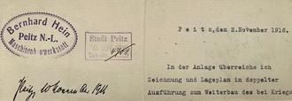 Unmittelbar nach dem 1. Weltkrieg erteilt B. HEIN dem als Betriebsleiter eingesetzten Otto HEIN (ein Sohn?) die Prokura, die das Peitzer Amtsgericht am 27. November als Gesamtprokura (mit Eduard HÜNDORF) bestätigt. Die Maschinenwerkstatt läuft noch drei Jahre. Eine Drahtziegelproduktion ist nicht dokumentiert gefunden. Auch in einer Protokollniederschrift einer Besprechung zum Antrag des Peitzer Magistrats auf Eingemeindung des Hüttenwerkes vom 28.10.1920 ist festgehalten, dass Oberregierungsrat NEUBAUR nebenbei allein die Maschinenfabrik von Hein erwähnt. HEIN hatte wie andere Peitzer Fabrikanten in patriotischer Überzeugung reichlich Kapital in Kriegsanleihen angelegt, das nun nicht mehr zur Verfügung steht. Am 28. Oktober 1921 beantragt B. HEIN die Löschung seiner Firma gegenüber dem Justizinspektor Paul GALLE im Amtsgericht Peitz. Da es kein Konkursverfahren gibt, sind höchstwahrscheinlich Kaufverhandlungen mit Paul STAUSS aus Cottbus vorausgegangen. HEIN geht in die Politik, wird Stadtverordneter und arbeitet in Ausschüssen der „Wirtschaftlichen Vereinigung“, einer bürgerlichen konservativen Verbindung, die in Peitz mit dem Landbund und den Vereinen der Beamten und der Hausbesitzer als Gegensatz zu den Gewerkschaften gegründet wird. Im Protokoll der Peitzer Stadtverordnetenversammlung vom 27.10.1924 ist vermerkt: „Der Ing. B. HEIN von der bürgerlichen Einheitsliste legt sein Amt als Stadtverordneter nieder, da er längere Zeit abwesend ist. Dafür wird der Buchdruckfabrikant R. RICHTER folgen…“. Dann verlieren sich die Spuren von HEIN, der, zumindest dem Namen nach, die Produktion von weltweit begehrten Drahtziegelgewebe nach Peitz brachte.