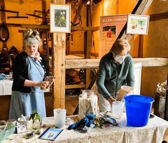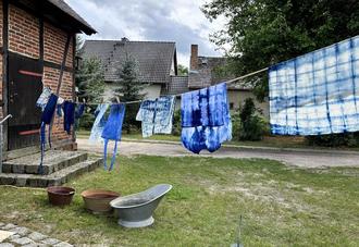 Zum Schluss hingen viele kleine Deckchen, ein Beutel und ein Shirt gefärbt auf der Wäscheleine unseres Museums. Alle Teilnehmer freuen sich schon auf den nächsten Arbeitsschritt in Richtung Blaudruck.