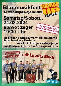 Am Vorabend ab 19.30 Uhr findet im Festzelt die „Warm-up Party“ zum Blasmusikfest statt. Die Blaskapelle Lausitzblech zusammen mit der Discothek „Orpheus“ werden diesen zünftigen Abend gestalten.