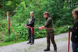 Dr. Antje Wurz und Sophie Büchner von der Wildnisstiftung durchschneiden das Eröffnungsband für den Wildnispfad.
