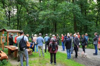 Die Besucher*innen der Wildnispfad-Eröffnung lauschen gebannt der Danksagung der Wildnisstiftung an regionale Partner und Unternehmen.